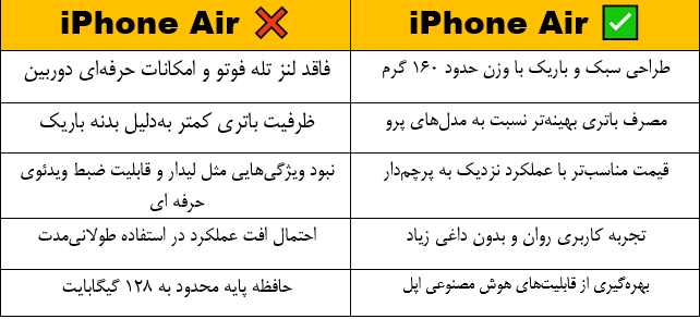 با توجه به اطلاعات و تحلیل کارشناسان، iPhone Air مثل هر محصول دیگهای نقاط قوت و محدودیتهای خاص خودشو داره.